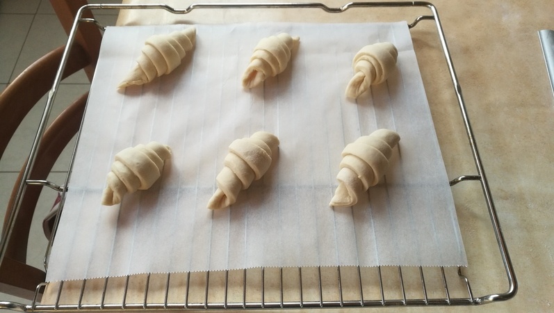 Posez les croissants sur une plaque à pâtisserie recouverte de papier sulfurisé et laissez les croissants doubler de volume à température ambiante ou dans le four fermé et éteint.