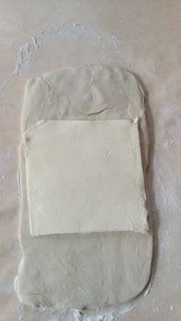 Placez le carré de beurre au milieu de l’abaisse de détrempe et refermez la pâte sur le beurre. Veillez à ce que le beurre ne soit apparent sur aucun côté de votre rectangle fermé.