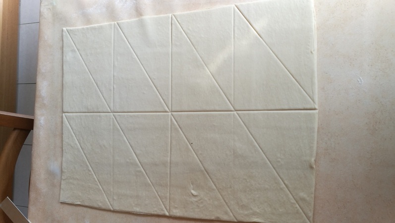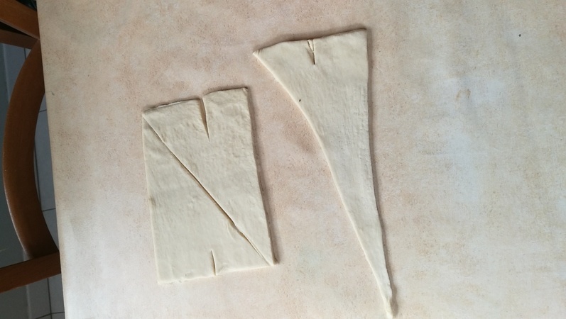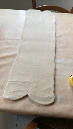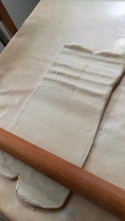 Sur le plan de travail légèrement fariné, posez votre pâton et étalez le au rouleau en un rectangle de 20cm sur 60cm.