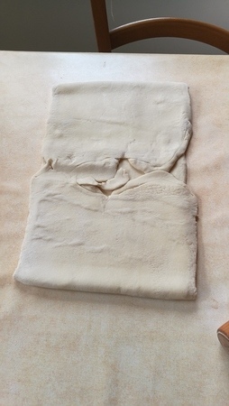 Lorsque la pâte a doublé de volume, le temps de pousse peut varier, récupérez le pâton et poser le sur le plan de travail légèrement fariné et, au rouleau, allongez le en un rectangle de 20cm sur 40cm.