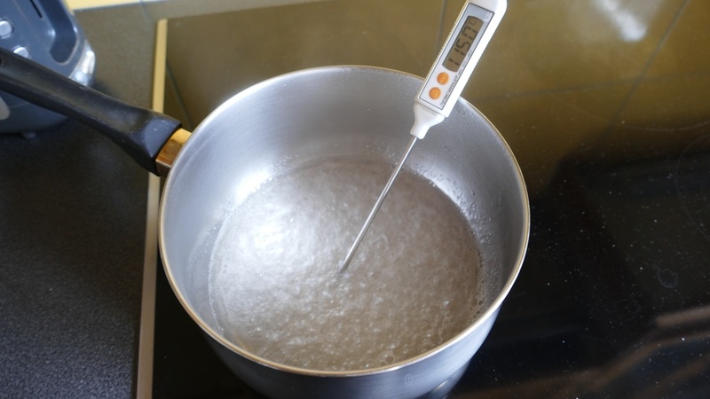 Faites chauffer le sucre jusqu’à 118°. Si vous n’avez pas de thermomètre, c’est quand le sucre est en ébullition et que les bulles deviennent un peu visqueuses.
