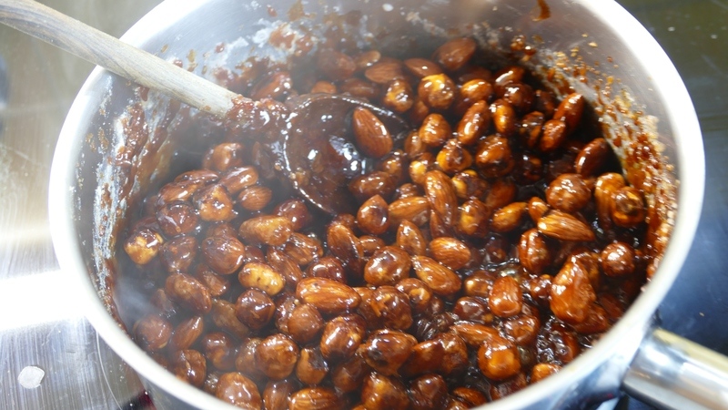 Puis il va fondre de nouveau et commencer à caraméliser. Continuez à bien remuer en remontant régulièrement les fruits secs du fond vers le haut.
