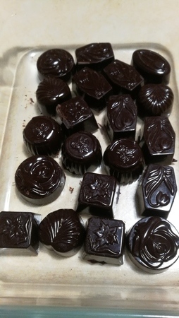 Laissez de nouveau refroidir une heure et démoulez les chocolats en retournant le moule et le tapant d’un coup sec sur la table. Les chocolats doivent se décoller tous seuls.
