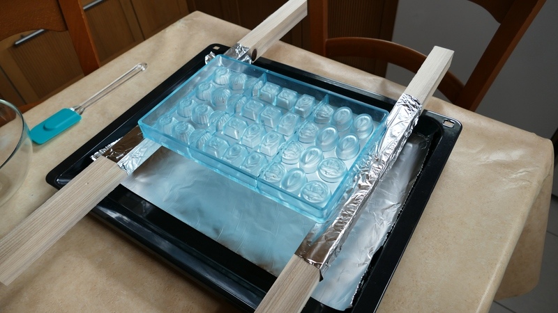 Ne remplissez pas complètement les alvéoles, recouvrez les avec une couche de chocolat fondu, enlevez le chocolat en trop avec une maryse.