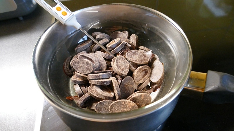 Retirez le bol du bain-marie quand le chocolat à atteint les 50-55°C (45-50°C pour le chocolat au lait et 45-50°C pour le chocolat blanc).
