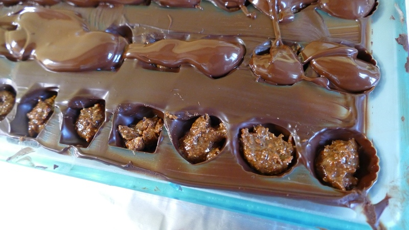 Garnissez les alvéoles de la garniture que vous aurez préparée avec un mélange de pralin et de praliné (voir recette).