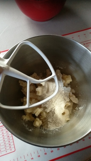 Mélanger à la feuille le beurre et les farines. On met d’abord le beurre puis la farine dessus.