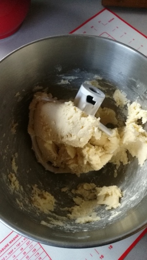 Battre à la feuille en 1ère vitesse le sucre, le beurre et la poudre d’amande jusqu’à ce qu’il n’y ait plus de morceau de beurre.