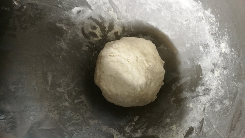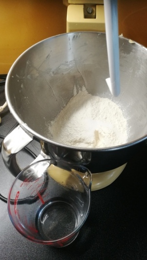 On met les farines et le sel. On ne verse l’eau que quand on commence à battre au crochet lentement et pas longtemps, sinon ce sera dur à étaler.