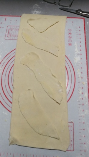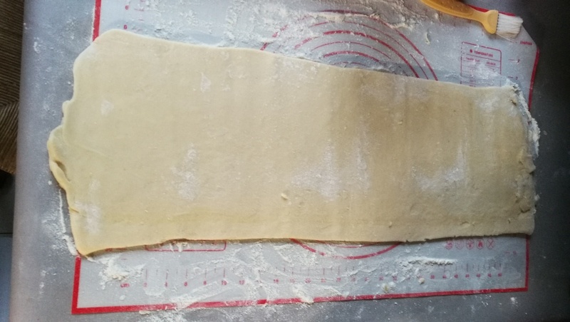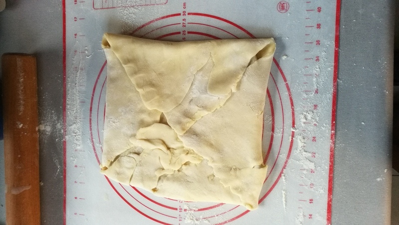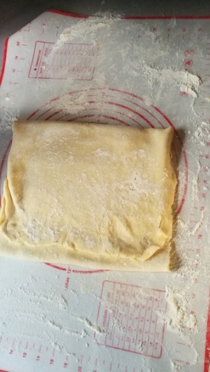 Petite astuce pour avoir un joli carré, avant le dernier tour, couper les bords afin de faire un rectangle bien propre, aplatir les morceaux de pâte découpés et les remettre sur le rectangle avant de faire les trois plis.