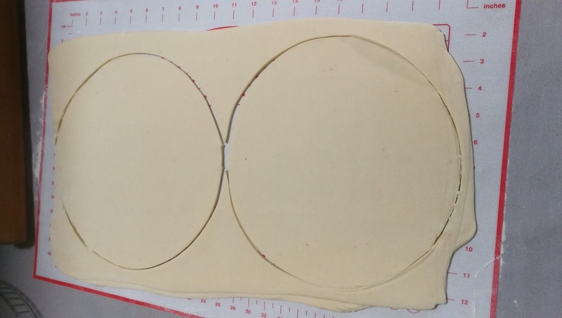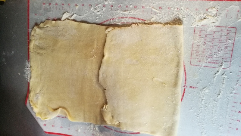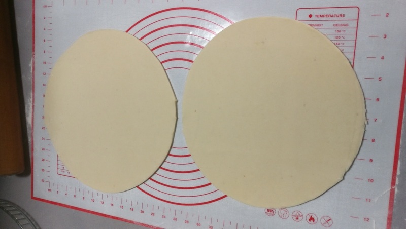 Etaler la pâte en un grand rectangle ou 2 carrés dans lequel on coupera 2 ronds de pâte d’environ 27 cm.