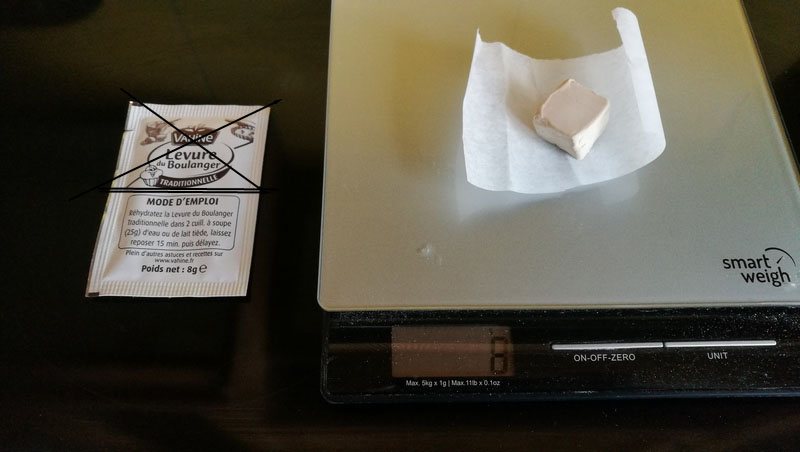 | 8 g de levure fraîche ou 4 g de levure sèche | 150 g de lait entier | 50 g de beurre ramolli |