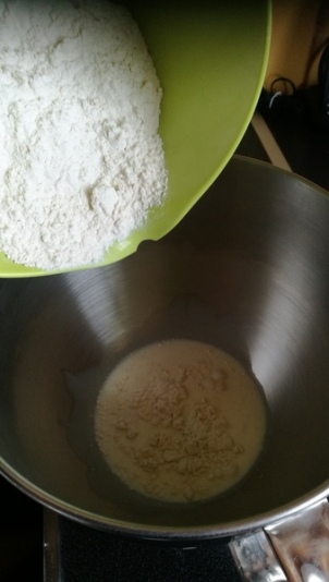 | Mettre le lait dans le bol du robot | puis la farine | et enfin la levure à l’opposé du sel et du sucre. |