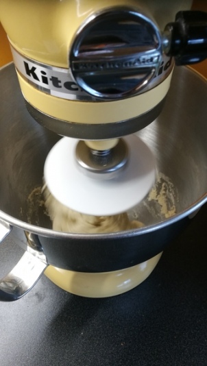 | Battre 6 mn en vitesse 1 | puis 4 mn en vitesse 2 et 6 mn en vitesse 1 en incorporant le beurre ramolli progressivement. |