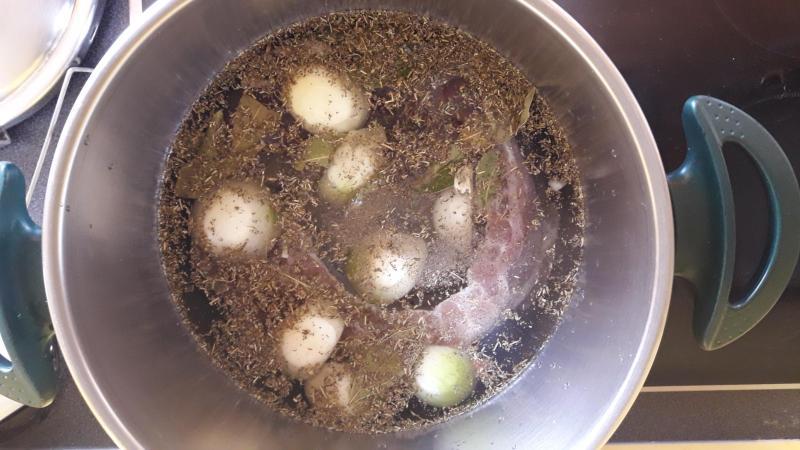 Ajouter les oignons et l’ail tous deux en entier, pour ne pas qu’ils se démolissent à la cuisson, thym, laurier et poivre. Ne pas saler.