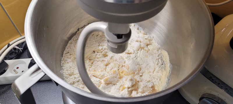 pétrir en petite vitesse pendant 10 à 15 mn (selon la farine)