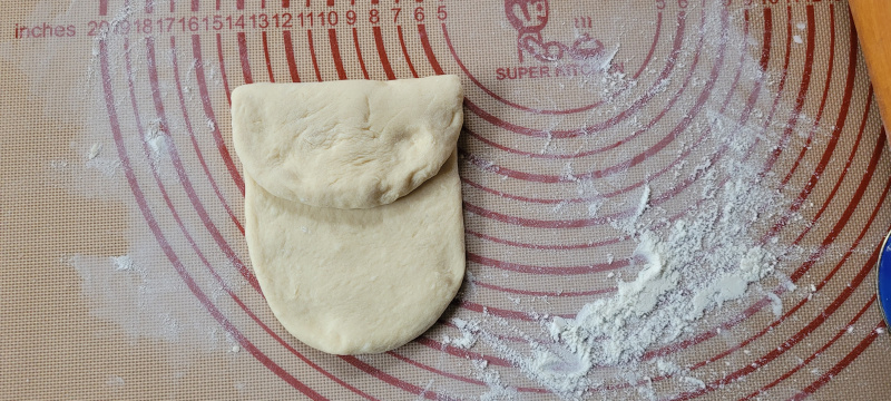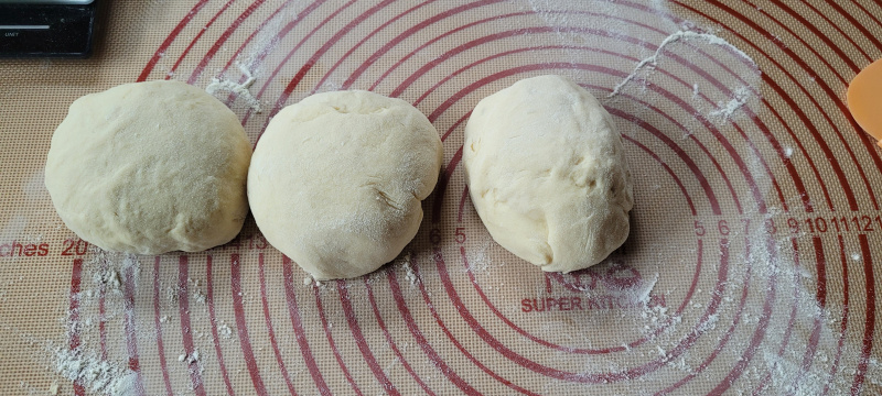 Une fois la pâte bien levée, séparez la en trois parts égales et faites trois (cinq) pâtons en forme de boule.