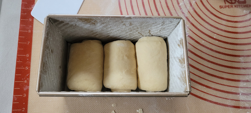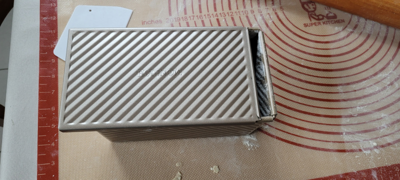 La recette ci-dessous est pour un moule standard prévu pour 450g de pâte (21.5 cm x 12.3 cm x 11.4 cm). Les chiffres entre parenthèses sont pour un moule prévu pour jusqu’à 1kg de pâte (35 cm x 13.5 cm x 12 cm)